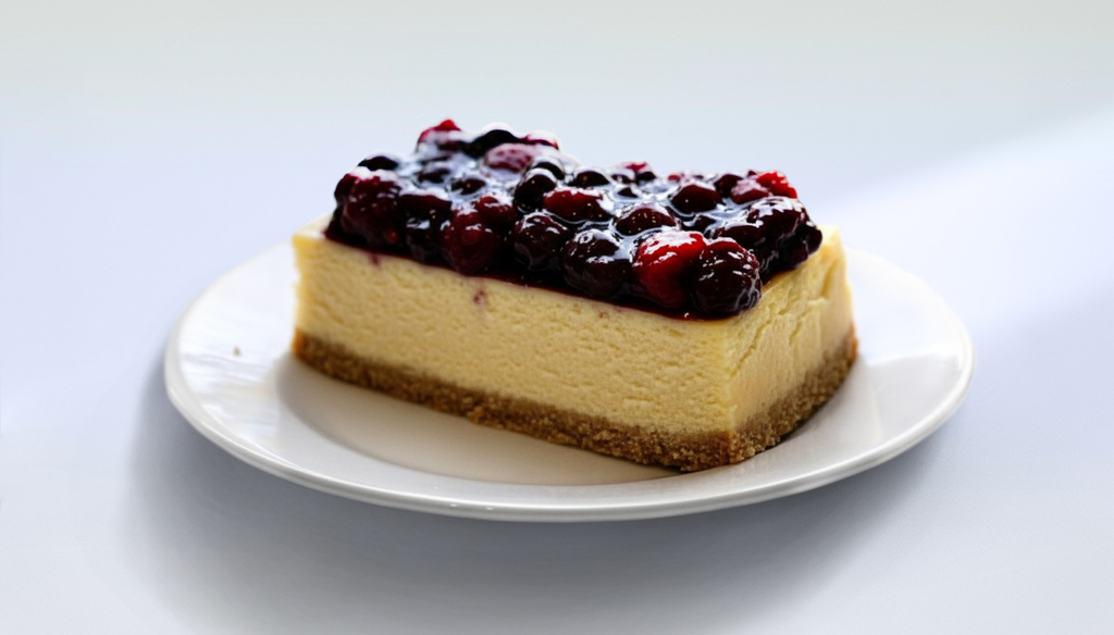 Base de galleta + Relleno cremoso de queso + Salsa de frutos rojos